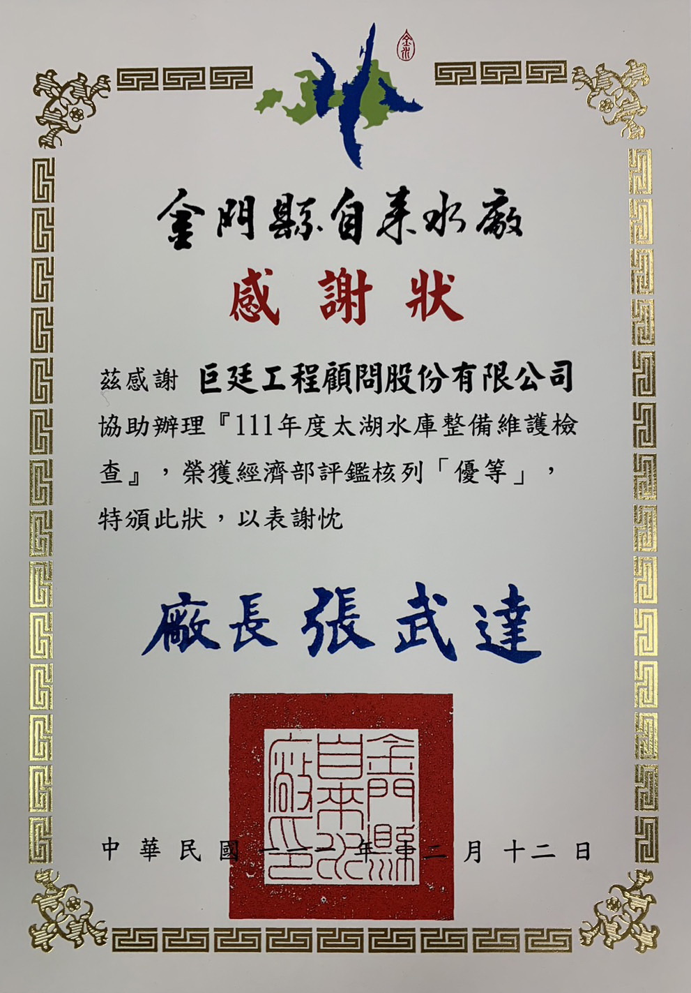 111年度太湖水庫整備維護檢查榮獲經濟部評鑑核列優等
