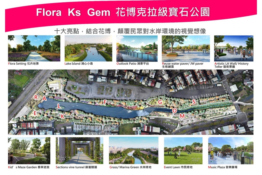 1.園區以「水」為發想,將水域環境景觀營造,重新詮釋水與G、N、P的精神,實現水岸花都的願景。