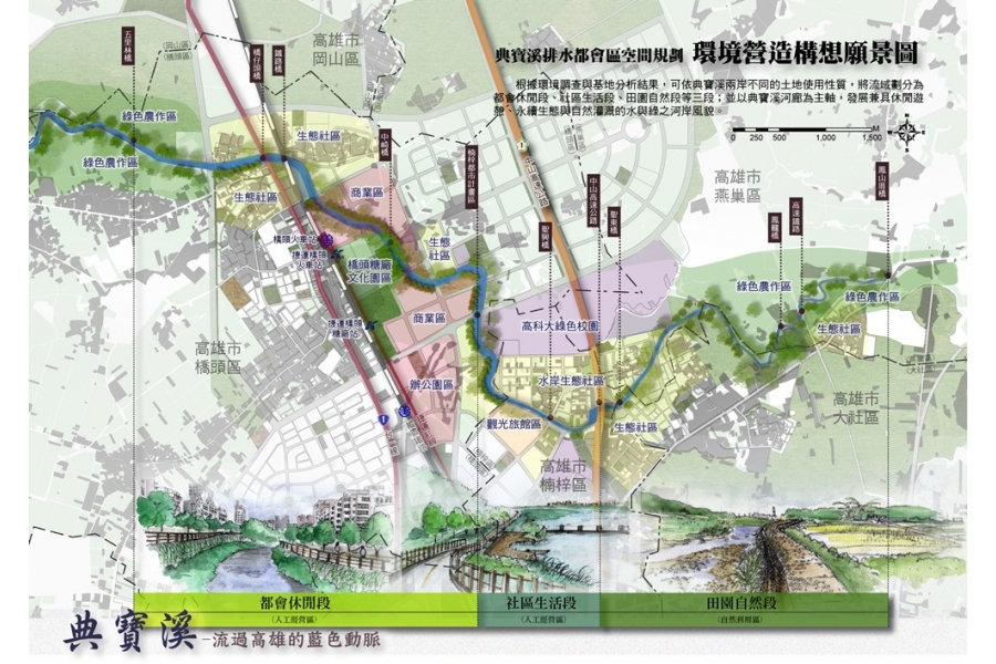 高雄地區典寶溪排水長度約32公里,集水面積約106平方公里,其中游段約有10公里穿越高雄新市鎮特定區、楠梓交流道特定區及楠梓都市計畫區,由於近年來極端降雨現象增加,導致典寶溪集水區多次受颱洪侵襲,造成淹水災害,為增加典寶溪集水區之容洪能力,兼顧生態、多樣的人文與自然景觀,以及創造典寶溪排水全新的藍帶風貌,本計畫針對前開三處都市計畫區內之典寶溪集水區,不單以傳統河道治理的方式進行都會防洪,而是在綜合治水原則下,導入流域分擔洪流概念,即在不改變既有河道防護標準,透過「都會空間」的規劃機制,分擔地表逕流,降低暴雨洪峰流量,並對區域排水空間多元化利用,俾供未來辦理典寶溪排水綜合治水檢討及都市規劃之參考。